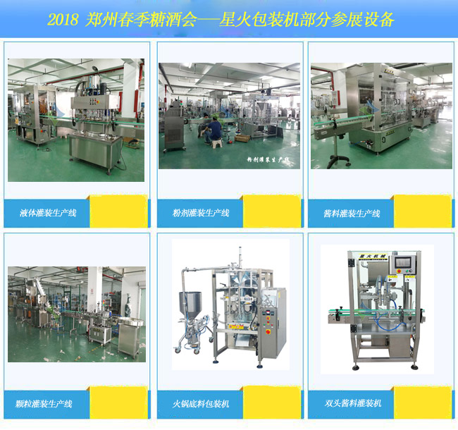 據(jù)悉2018年鄭州糖酒會劃分酒類與包裝展區(qū)、特色黃酒展區(qū)、國際葡萄酒展區(qū)、高端食品飲料展區(qū)、綜合食品飲料展區(qū)(室外)、食品包裝技術(shù)與加工設(shè)備展區(qū);星火包裝機(jī)也申請到了特展展位,將為大家?guī)硪后w灌裝生產(chǎn)線、膏體灌裝生產(chǎn)線、醬料灌裝生產(chǎn)線、粉體灌裝生產(chǎn)線、顆粒灌裝生產(chǎn)線、自動給袋包裝機(jī)、火鍋底料全自動包裝生產(chǎn)線等設(shè)備